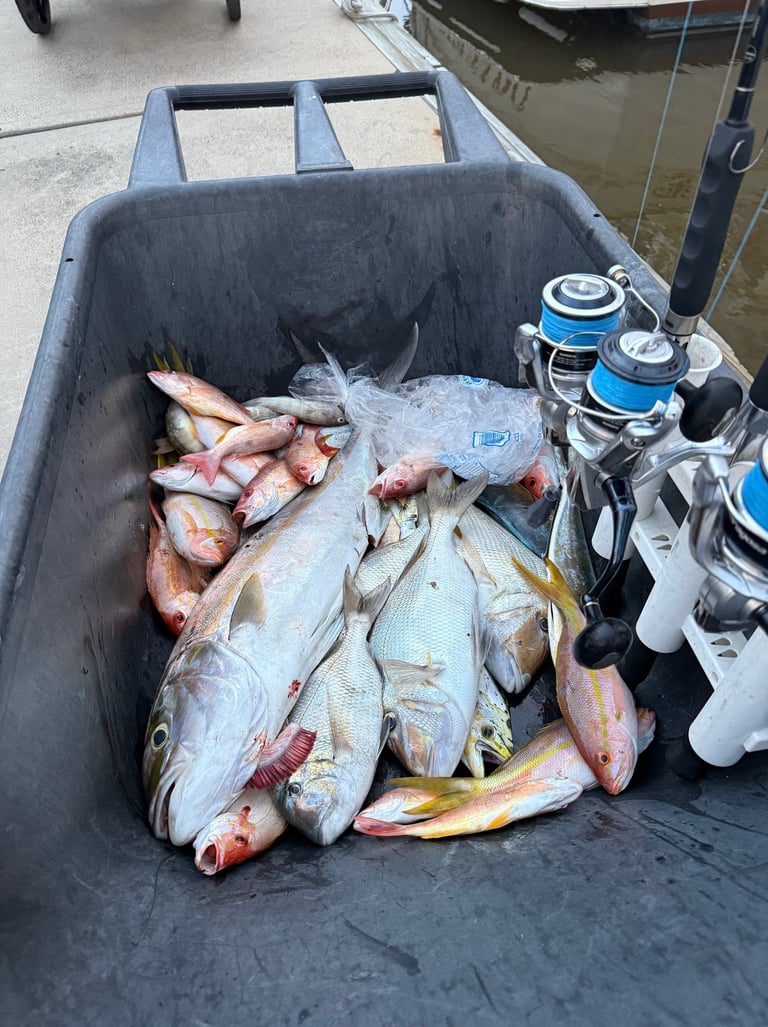 ⚓ The Experience: We leave early, before sunrise, and run 50–80+ miles into the Gulf. The farther we go, the bigger the fish and the more untouched the water. You'll fish a mix of natural bottom, artificial reefs, and deepwater wrecks—targeting both pelagic and reef species using live bait, jigs, and trolling setups. Our Twin Vee center console ensures a stable, dry ride all day long, with plenty of room to fight fish from any angle. With a knowledgeable crew and top-tier equipment, this is your shot at the Gulf’s hardest-hitting predators and best-tasting catches